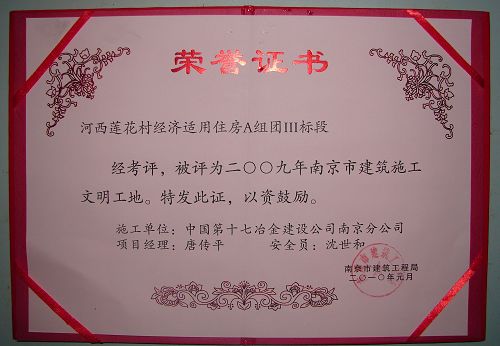 从南京市建筑工程局获悉,十七冶南京分公司河西莲花村经济适用房A组团Ⅲ标段获得南京市2009年“建筑施工文明工地”荣誉称号。