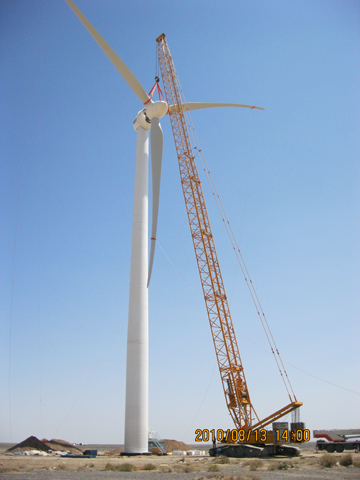 甘肃龙源瓜州300MW自主化示范项目二期250.5MW风电工程,地处甘肃省酒泉地区瓜州县城西北约20KM处,风电场处在人烟稀少的戈壁之中,是亚洲最大风场和世界四大风能基地之一。施工现场目前地表温度高达50多摄氏度,而且多大风天气。由于该工程是水冷改风冷机型,安装程序复杂,安装工艺要求高,增加了施工的难度。项目部全体员工团结协作,精心组织,力争以优质的服务、优良的质量,安全高效地完成施工任务。