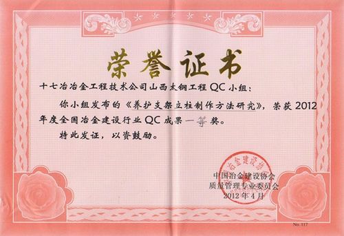 日前,在中国冶金建设协会质量管理专业委员会组织召开的2012年全国冶金建设行业质量管理小组成果评审交流会上,中国十七冶集团冶金工程技术公司山西太钢项目发布的《养护支架立柱制作方法研究》荣获一等奖。