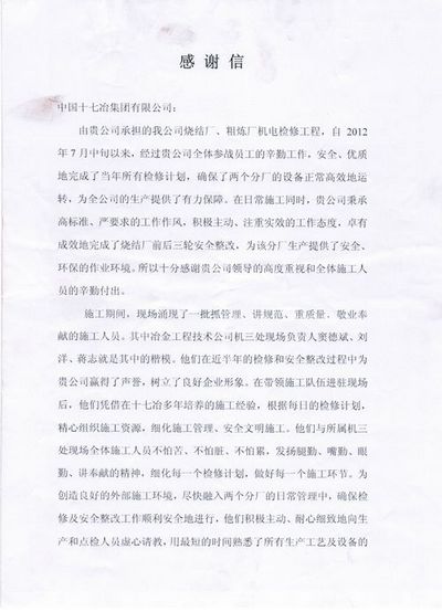 日前,宝钢德盛不锈钢有限公司向中国十七冶集团致感谢信,对我公司安全、优质地完成了宝钢德盛不锈钢有限公司烧结厂、粗炼厂机电检修工程检修计划,为该公司生产提供了安全环保的作业环境,为设备正常高效运转提供了有力保障表示衷心感谢。