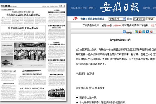 3月26日的《安徽日报》在第二版以《皖军建功泰山站》为题,图文并茂报道了十七冶参建员工从南极泰山站顺利凯旋以及项目建设情况,《新安晚报》也长篇报道了公司员工建站中如何克服各种前所未有的困难,并配发了图片。