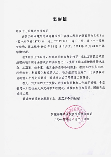 日前,安徽海螺创业投资有限责任公司向中国十七冶集团发来表彰信,感谢中国十七冶集团在海螺医院工程建设中给予的大力支持,表扬城建工程技术公司海螺医院项目部在施工中的突出成绩。