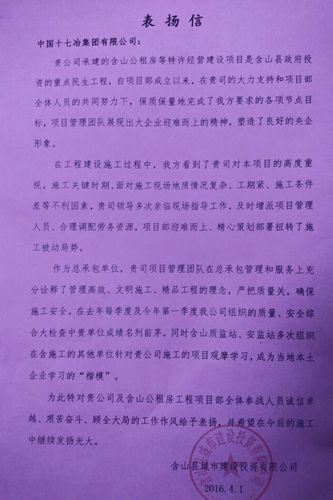 41日,含山县城市投资建设有限公司向中国十七冶集团发来表扬信,对中国十七冶集团房屋工程技术公司含山公租房项目部诚信卓越、艰苦奋斗、顾全大局的工作作风给予表扬。