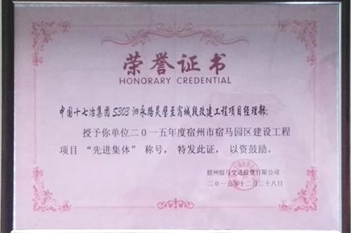 日前,中国十七冶集团路桥工程技术公司S303泗永路灵璧至宿城段改建工程项目经理部被宿州宿马交通投资有限公司授予二〇一五年度宿州市宿马园区建设工程项目“先进集体”光荣称号。