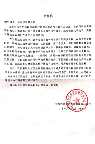 蚌埠河北新区发展有限责任公司向十七冶致表扬信