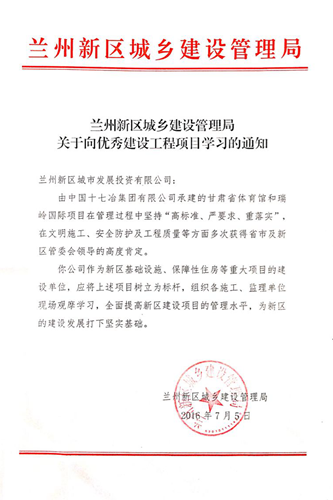 日前,兰州新区城建局和城投公司分别发文,对中国十七冶集团甘肃分公司在甘肃省体育馆项目和瑞玲国际项目建设过程中的良好表现给予表彰。