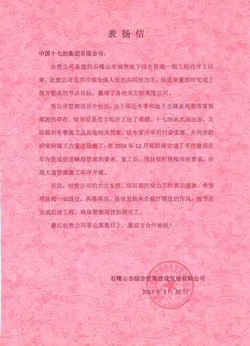 3月30日,中国十七冶集团有限公司接到石嘴山市综合管廊建设发展有限公司发来的表扬信,对中国十七冶集团冶金工程技术公司在宁夏石嘴山城市地下综合管廊工程的施工过程中,保质保量完成各项节点目标,以及所展示出的公司形象和央企作风给予高度赞扬。