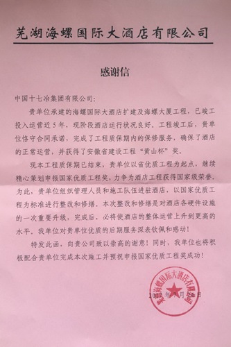 84日下午,芜湖海螺国际大酒店副经理沈波一行来访中国十七冶集团总部,赠送一面绣有“服务全心全意,质量百里挑一”的锦旗和感谢信,对中国十七冶集团在海螺国际大酒店工程建设中作出的贡献表示衷心感谢。