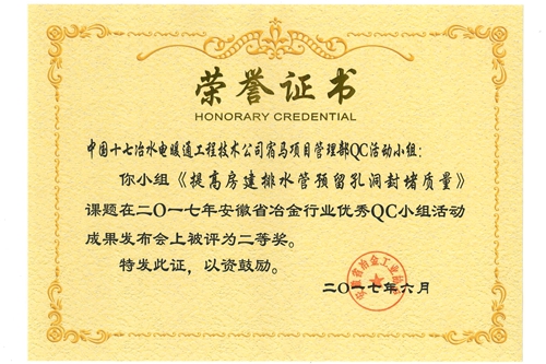 分解落实指标,科技创新取得成果。组织公司管理人员开展技术创新等方面的知识培训,通过督促、指导项目工程技术人员积极参与科技创新工作。全年向集团申报可行性研究项目1个;专利受理4项;2017年安徽省冶金行业优秀QC小组活动成果发布会上公司《提高房建排水管预留孔洞封堵质量》被评为二等奖。
