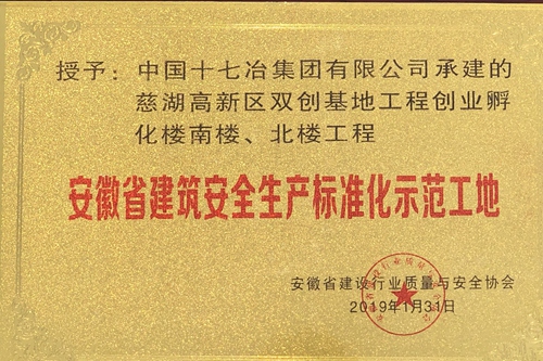 3月11日,中冶置业(安徽)公司马鞍山慈湖双创项目部收到安徽省建设行业质量与安全协会发来的文件,慈湖高新区双创基地工程荣获“2018年度安徽省建筑安全生产标准化示范工程”称号。