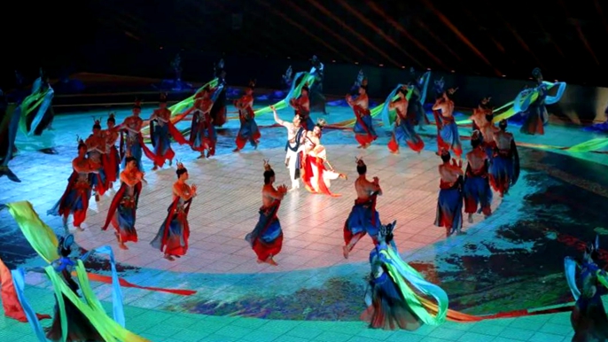 开幕式分为《回响》黄河篇、《丝路》一带一路篇和《鸿鹄志》乒乓篇,三大篇章以“艺术科技”助力,以梦幻光束、三维搭建揭开光影秀帷幕,融合视觉、听觉、触觉三位一体的方式,讲述黄河历史的变迁和千年丝路的传奇。表演最后,奥运歌曲《站起来》,让现场每位观众心中回荡“更快、更高、更强”的奥运精神,将全场的氛围推向了高潮。
