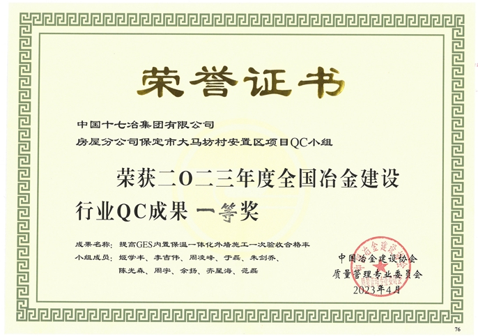 为提高北方地区房屋保温质量,项目团队突破常规保温施工技术,大胆采用刚刚处于推广阶段的GES内置保温一体化工艺。但在实际应用中,技术人员发现改技术容易出现保温钉外露、钢丝网裸露、蜂窝麻面质量问题,后期修补存在空鼓、脱落隐患,且修补难度大成本高。为解决这一质量难题,项目管理人员及主要技术骨干组成QC小组针对“提高GES内置保温一体化外墙施工一次验收合格率”开展质量提升活动。经过多次优化调整,QC小组将GES内置保温一体化外墙施工一次验收合格率由最初的89.26%提升至97.8%。《提高GES内置保温一体化外墙施工一次验收合格率》QC成果荣获2023年度全国冶金建设行业一等奖。截至目前,项目团队共申报在审发明专利13项、实用新型专利6项、QC成果3项,这些新技术新成果的应用显著提高了工程质量和施工效率。