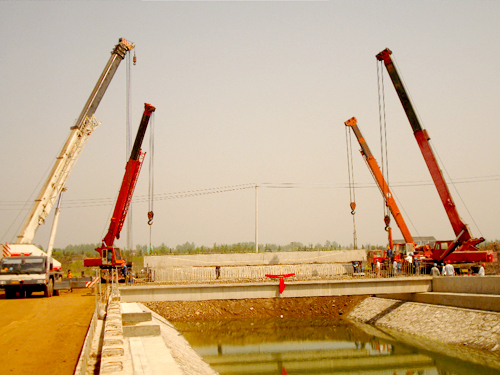 规划一号桥48片后张法预应力空心板梁,工程量大,施工环节较复杂。为了能尽快完成板梁安装,项目部根据现场实地情况编制合理可行的施工方案,方案采用2台35t汽车吊起梁、移梁,拖炮车配合运梁,上桥后2台45t汽车吊将板梁安装就位,预计在两天内完成规划一号桥的板梁安装。
