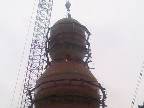 3月31日下午5时18分,机电公司机装五处完成了对热风炉的最后一吊,标志着江西萍钢450m3高炉技术改造工程热风炉顺利封顶,成功地实现了3月底热风炉封顶的节点目标。 450m3高炉工程是在3月5日进行了热风炉第一带吊装,许多关键钢结构在3月30日才到达现场。机装五处所有员工在恶劣天气下连续作业36小时,成功地保住了这个节点。在这短短一个月的时间里,所有参战人员同心协力,克服困难,出色完成了艰巨的任务,兑现了对业主的第一个承诺。