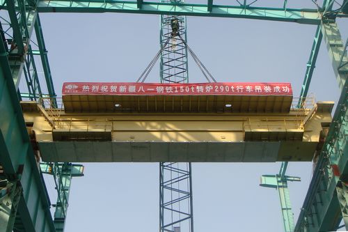 106上午1018分,由冶金工程技术公司承建的新疆八一钢铁150t转炉工程290t行车随着指挥员的哨声徐徐升起,平稳就位轨道。