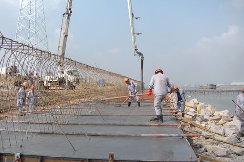 1022上午,在路桥工程技术公司承建的珠海横琴新区滨海次干路及景观工程项目施工现场,伴随着混凝土输送泵的轰鸣声,K2+540K2+640段防浪堤基础开始进行混凝土浇筑,海堤项目全面进入堤身主体结构施工阶段。