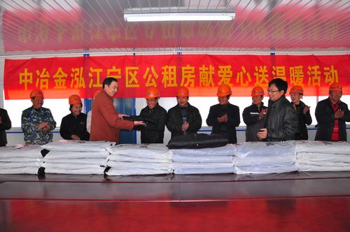 南京江宁区住建局副局长丁勇在金泓置业公司常务副总经理李彬等人的陪同下,来到江宁区公租房工地,将一件件厚厚的防寒棉衣送到日夜奋战在工程一线员工手中,并给工地食堂送去了500多斤新鲜的猪肉。现场的数百名施工人员深受鼓舞。