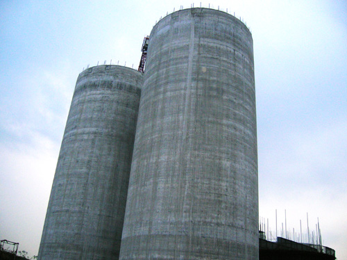 该工程共有6座体型相同的水泥库,均为直经18.38m、高45m的筒体,库体9m以下为双层库壁,库壁厚度分别为380cm350cm。项目部在总结以往施工经验的基础上,合理安排施工工序,对水泥库双层库壁同时进行双滑施工,减少施工流程和重复用工,保证了库体的整体性能。经过1010夜的连续奋战,项目部顺利完成了2个水泥库体滑模任务。经业主和监理单位检查验收,库体垂直度、混凝土密实度及观感均得到高度认可。