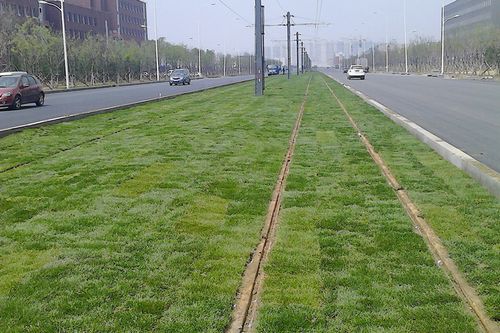 绿化草坪的铺植,使轨道掩藏在草坪中间,从表面看不到铁轨,电车运营时,就像在草坪上飞驰,将成为沈阳城市交通一道亮丽的风景线。沈阳现代有轨电车1号线工程需绿化填土4.2万立方,绿化草坪植被面积达10.1万平米。在正线全线轨道铺设顺利通过验收后,项目部发扬“高效严谨、精细务实”的企业作风,科学组织,制定周密的施工方案,积极调配各项资源,克服时间紧、任务重,东北地区春季气温偏低等诸多困难,积极创造条件,加快施工进度,迅速组织完成绿化土方填筑任务,使正线具备了绿化草坪铺植条件。施工过程中,草坪的铺植以草质优良、铺设平整、间隙匀称受到了业主、监理及质检部门的高度评价,并组织其他兄弟单位来现场观摩学习。