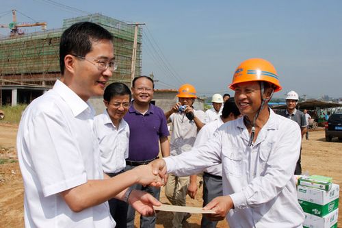 82,马鞍山市含山县县委书记孙军,县委常委、常务副县长李怀东一行来到水泥工程技术公司承建的地球卫士(含山)年产60万吨多功能环保新材料厂房项目施工现场,看望慰问高温下坚守岗位的一线员工,并送来了防暑降温慰问品。