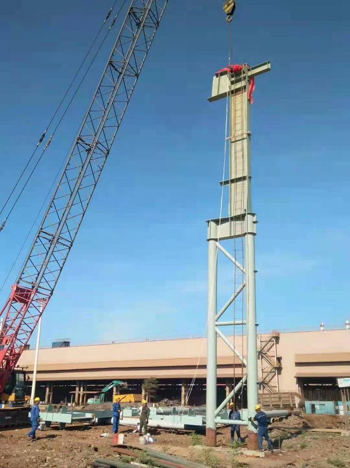首吊钢柱高17.5米,重量约为6.8吨。由于业主工期要求紧,任务重、质量标准高,市场钢结构价格上涨幅度大,为此项目部前期精心策划,科学组织,整合资源,统一安排,经过不懈努力,顺利完成主厂房钢结构吊装节点,为后续主厂房桁架系统及设备安装创造有利条件。