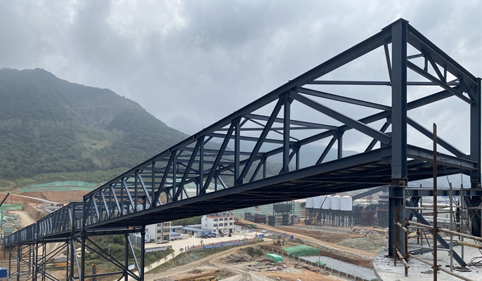 厂区回料输送-3廊道全长约120米,由四段30米长钢桁架组成,从二级破碎地沟出口引出后经过五段依次递进升高的钢支架后到达近45米高的熔剂库顶,其吊装难度和高度是目前厂区内钢桁架吊装之最。