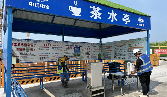 目前工程处于土方开挖阶段,为确保各项节点有序推进,项目部积极落实两级公司防暑降温工作部署,实行“做两头、歇中间”的施工办法,合理安排高温时段作息时间。现场设置茶水亭、热水炉,每日安排专人负责供应茶水及绿豆汤等防暑降温饮品,保障工人在工作间隙得到充分的休息。坚持安全、生产两手抓,加强夏季极端天气条件下安全生产工作,做实项目部相关安全管理办法和各项防暑降温措施的实施,提高了全员夏季安全生产意识,维护了现场劳动人员身体健康,确保安全生产形势稳定发展,为项目部努力达成零事故的安全管理目标和掀起工程大干热潮提供保障。