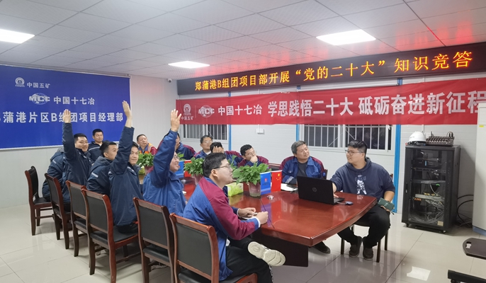 为深入学习贯彻党的二十大精神,丰富学习形式,11月24日,中冶置业(安徽)公司郑蒲港片区B组团项目部组织开展“学思践悟二十大,砥砺奋进新征程”知识竞赛主题党日活动。