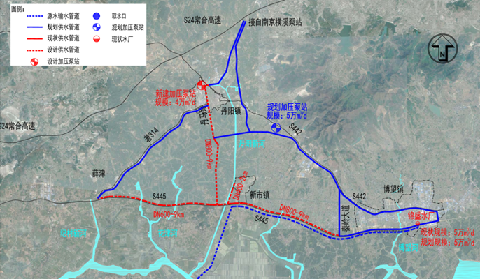 工程地处马鞍山市博望区,包含供水管道、加压泵站。其中加压泵站位于丹马路与丹向路交叉口西南角,用地面积约8493.4平方米,设计流量为4万立方米/天,选用四台双吸离心泵,三用一备;供水管道总长29千米,设计管径为DN400-DN800,起点为博望区七仙街省界处,管道承接南京区域供水管道,向南沿丹马路至皖445省道,再分别向西至丹阳镇丰盛水厂,向东至新市镇及秦岭大道,与供水管道连接后将对区域进行供水。本工程是博望区一项民生工程和重点水利工程,项目建成投用后,博望区及其下辖镇区的供水将由南京市江宁、锦盛两水厂联合供水,有效解决原有供水量不足、供水效率低、水源单一、水质不达标等问题,保障了博望区生活用水与生产用水,为产业发展奠定良好基础。