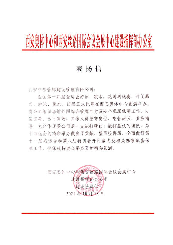 近日,中国十七冶集团旗下承担西安市地下综合管廊项目建设与运营职能的西安中冶管廊建设管理有限公司,收到了西安奥体中心和西安丝路国际会议会展中心建设指挥部发来的表扬信,对公司在组织第十四届全运会场馆外围综合管廊电力及安全保障工作中展现出的“坚守岗位、吃苦耐劳、业务精湛、能打硬仗、能打胜仗”精神表示高度的赞扬。