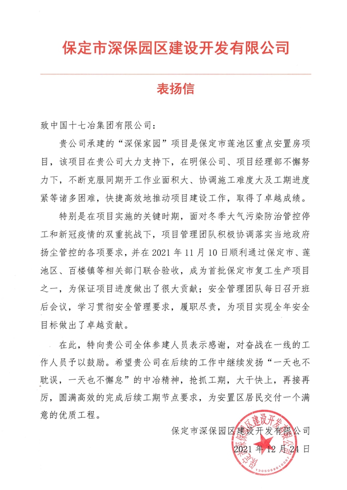 12月31日,保定市深保园区建设开发有限公司向中国十七冶集团致表扬信,对市政工程技术分公司承建的保定深保家园EPC总承包项目快捷高效地推动项目建设工作,取得卓越成绩提出表扬并表示感谢。
