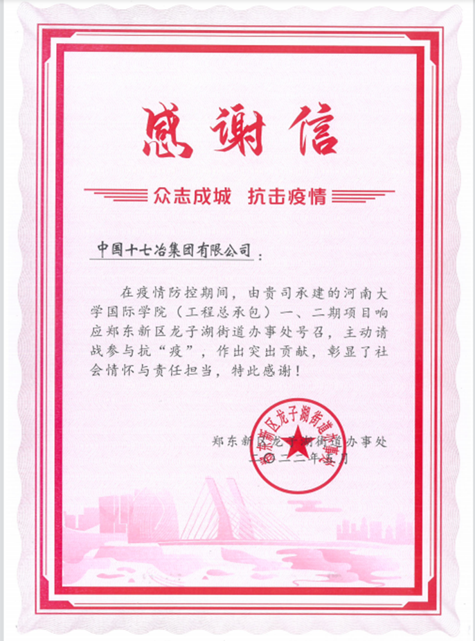 6月20日,中国十七冶集团有限公司收到了来自郑东新区龙子湖街道办事处感谢信,对中冶置业(安徽)公司河南大学国际学院项目部在疫情防控期间所做的突出贡献表达了感谢。