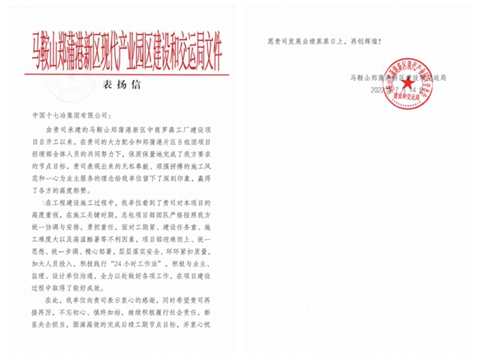 7月14日,马鞍山郑蒲港新区建设和交运局向中国十七冶集团发来表扬信,对中国十七冶集团承建的马鞍山郑蒲港新区中商罗森工厂建设项目及马鞍山综保区重工业厂区建设项目,保质保量完成业主方要求的节点目标提出表扬,对公司领导的高度重视及项目部全体人员的辛勤付出给予了高度称赞。
