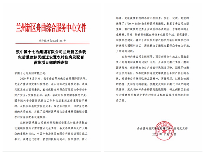 9月26日,中国十七冶集团收到兰州新区舟曲综合服务中心致来的感谢信,对甘肃分公司承建的兰州新区承接灾后重建移民搬迁安置农村住房及配套项目按计划稳步推进搬迁群众安置目标表示感谢。