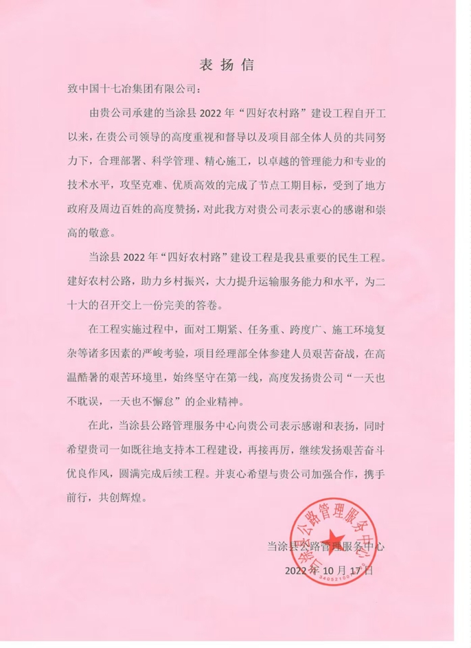 10月18日,中国十七冶集团收到当涂县公路管理中心致来的表扬信,对交通分公司承建的当涂县2022年“四好农村路”建设工程总承包(EPC)项目在疫情态势严峻和夏季高温酷暑等不利因素影响下,优质高效的完成工期节点目标任务给予表扬和表示感谢。