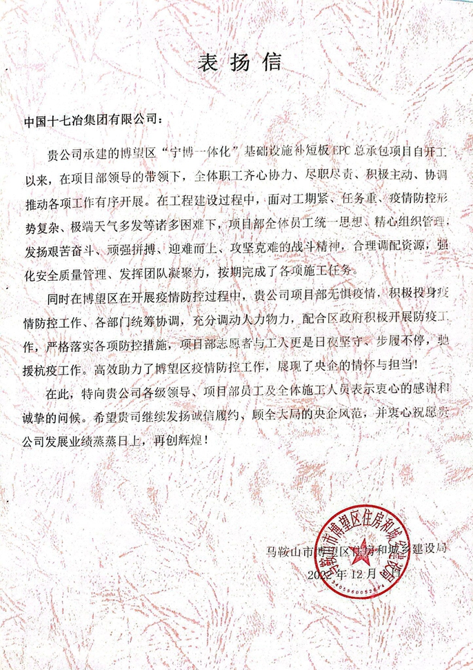 12月1日,中国十七冶集团收到马鞍山市博望区住房和城乡建设局发来的表扬信,对管廊分公司博望区“宁博一体化”基础设施补短板EPC总承包项目在施工中践行央企担当,优质高效地完成各项施工任务致以衷心的感谢。