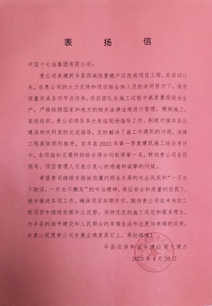 4月20日,江苏省徐州市丰县住房和城乡建设局代建办向中国十七冶集团致表扬信,对房屋分公司西城丽景棚改项目团队保障工程高效推进、在全县第一季度建筑施工综合考评中获得第一名的优异成绩表示感谢与赞扬。