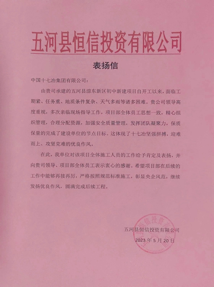 5月20日,五河县恒信投资有限公司向中国十七冶集团致表扬信,对市政分公司五河县漴东新区初中新建项目部保质保量如期完成首栋单体封顶目标给予肯定及表扬。