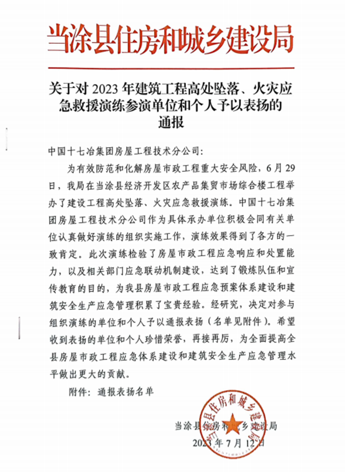 7月12日,当涂县住房和城乡建设局下发通知,对中国十七冶房屋分公司为日前住建局举办的建设工程高处坠落、火灾应急救援演练所做积极贡献表示高度赞扬。