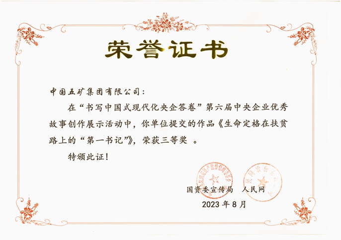 8月28日,国务院国资委宣传局联合人民网举办的“书写中国式现代化央企答卷”第六届中央企业优秀故事创作展示活动发布评选结果,中国十七冶报送的脱贫攻坚事迹典型《生命定格在扶贫路上的“第一书记”》获得三等奖,是中国五矿入选优秀案例唯一获奖作品。