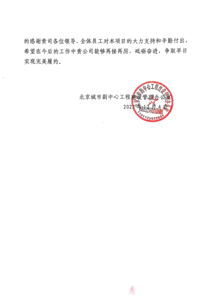 北京城市副中心建管办向中国十七冶致表扬信