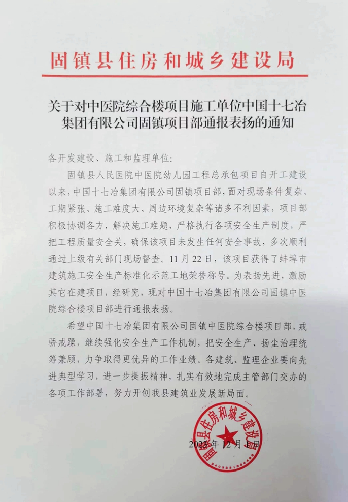 12月4日,蚌埠市固镇县住建局发布通知,对中国十七冶工建分公司固镇县中医院综合楼项目部严格执行安全生产制度,获评蚌埠市建筑施工安全生产标准化示范工地给予通报表扬。