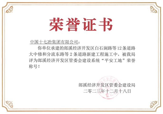 12月18日,中国十七冶路桥分公司承建的郎溪经开区白石涧路等12条道路大中修和分流东路等2条道路新建工程获授“郎溪经开区管委会建设系统‘平安工地’”。