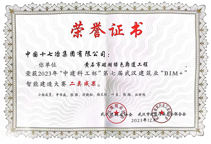 12月21日,2023年湖北省住建行业职业技能竞赛暨“中建科工杯”第七届武汉建筑业“BIM+”智能建造大赛发布获奖名单,中国十七冶黄石EOD项目磁湖绿色廊道工程申报的《BIM+GIS+IOT数字化集成应用》从166个优质项目脱颖而出,荣获二类成果。