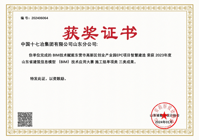 1月3日,2023年度山东省建筑信息模型(BIM)技术应用大赛获奖名单正式发布,中国十七冶山东分公司申报的《BIM技术赋能东营市高新区创业产业园EPC项目智慧建造》荣获大赛施工组单项类三等奖。