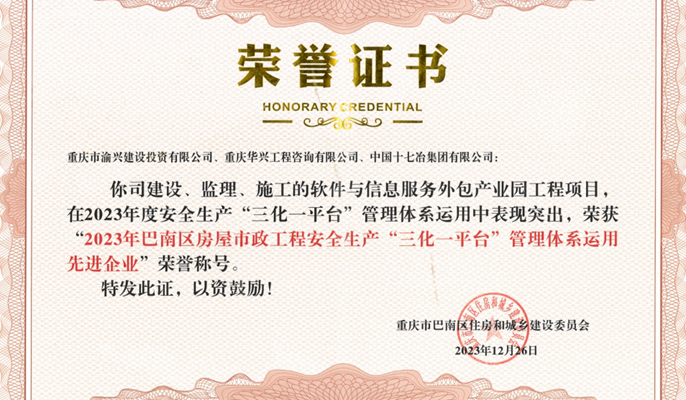中国十七冶获评重庆巴南区安全生产“三化一平台”管理体系运用先进企业