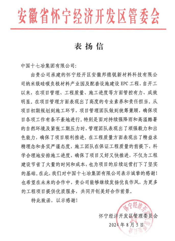 怀宁经开区管委会向中国十七冶致表扬信