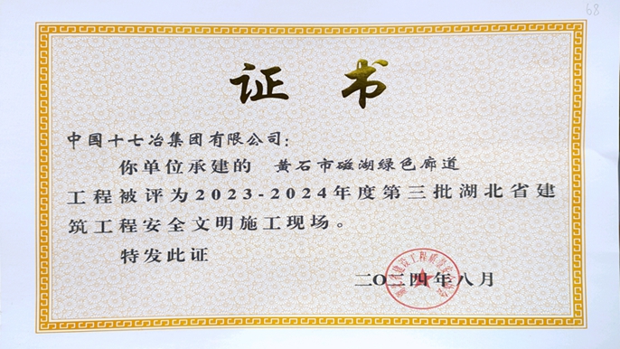 近日,2023-2024年度第三批“湖北省建筑工程安全文明施工现场(楚天杯)”评比结果正式公布,中国十七冶承建的黄石磁湖绿色廊道项目获评“湖北省建筑工程安全文明施工现场”。