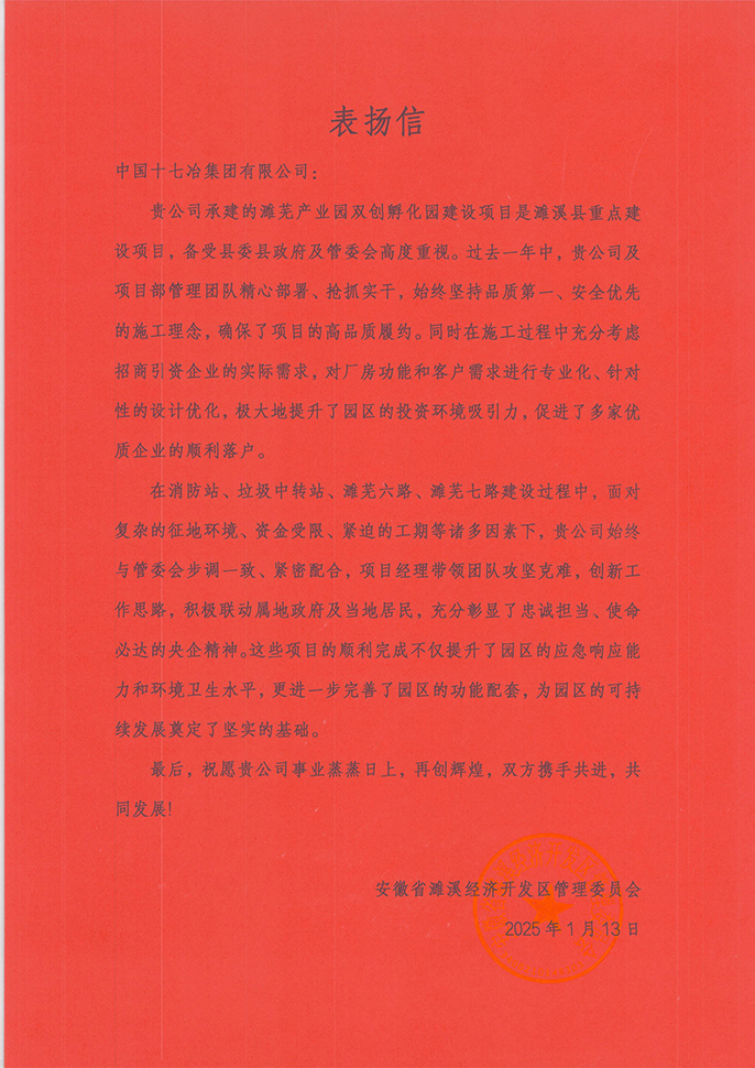 濉溪县经开区管委会向中国十七冶致表扬信