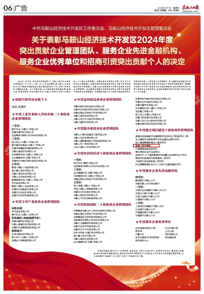 近日,马鞍山经开区党工委、管委会发布《关于表彰马鞍山经开区2024年度突出贡献企业管理团队、服务企业先进金融机构服务企业优秀单位和招商引资突出贡献个人的决定》,中国十七冶房屋分公司马鞍山章塘二期安置房项目团队荣获重点项目建设十强优秀管理团队”。